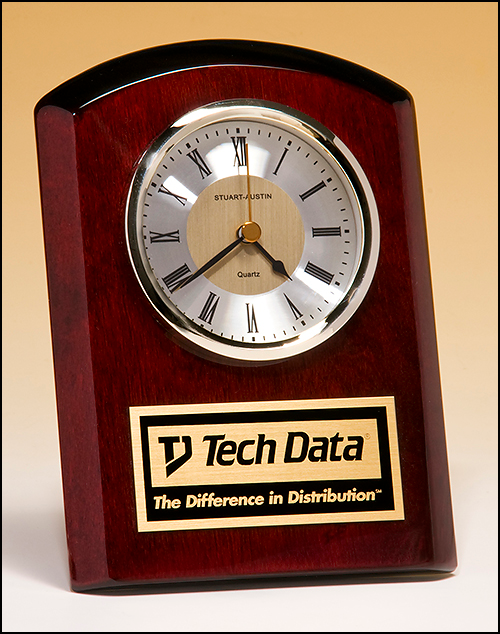 Rosewood piano-finish clock, diamond-spun dial, three-hand movement, easel post. Laser engravable brass plate. Batteries included. Clock movement guaranteed for life. 5" x 7"